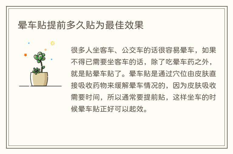 很多人坐客车、公交车的话很容易晕车,如果不得已需要坐客车的话,除了吃晕车药之外,就是贴晕车贴了。晕车贴是通过穴位由皮肤直接吸收药物来缓解晕车情况的,因为皮肤吸收需要时间,所以通常要提前贴,这样坐车的时候晕车贴正好可以起效。