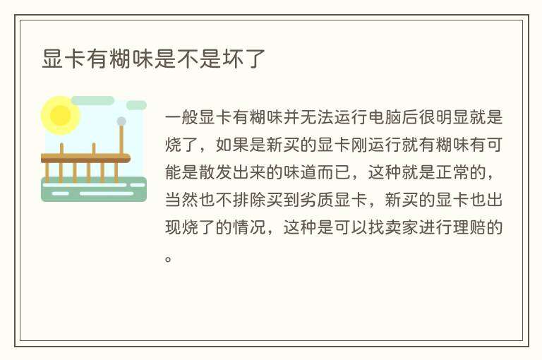 一般显卡有糊味并无法运行电脑后很明显就是烧了,如果是新买的显卡刚运行就有糊味有可能是散发出来的味道而已,这种就是正常的,当然也不排除买到劣质显卡,新买的显卡也出现烧了的情况,这种是可以找卖家进行理赔的。