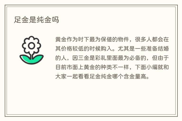 足金好还是纯金好呢是时下很多人都有的疑问 ,毕竟大部分人在买金的时候都会将二者混为一谈,不过相较于足金肯定是纯金更好。因为足金的含金量不低于99%,纯金的含金量不低于99.9%。其实从理论上讲,纯金的含金量应该是100%,但技术还达不到这个水平,所以现在黄金纯度的最高值为99.999999%。通常来讲,纯度越高的黄金,保值性和增值性越好,因此纯金的价值要比足金高。但纯度越高的黄金,成本也越高,所以在选择黄金时,需要根据自己的实际情况来选择。