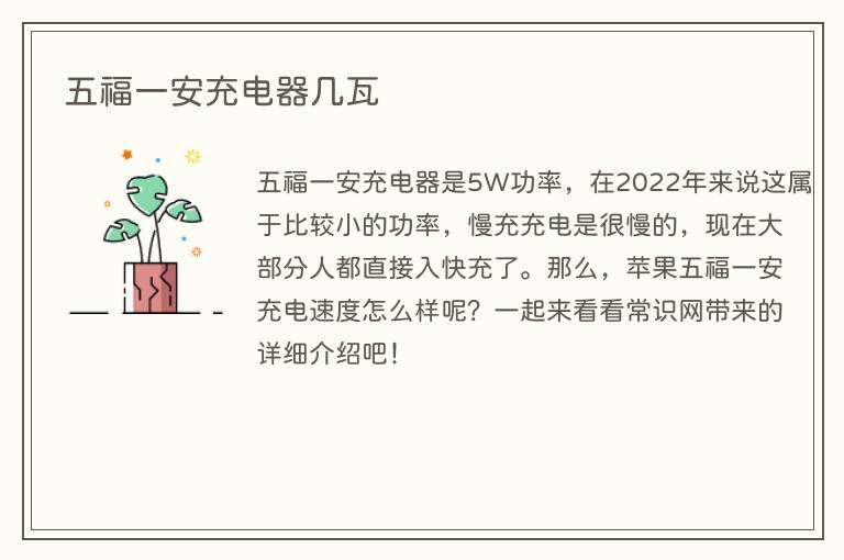 五福一安充电器是5W功率,在2022年来说这属于比较小的功率,慢充充电是很慢的,现在大部分人都直接入快充了。那么,苹果五福一安充电速度怎么样呢?一起来看看常识网带来的详细介绍吧!