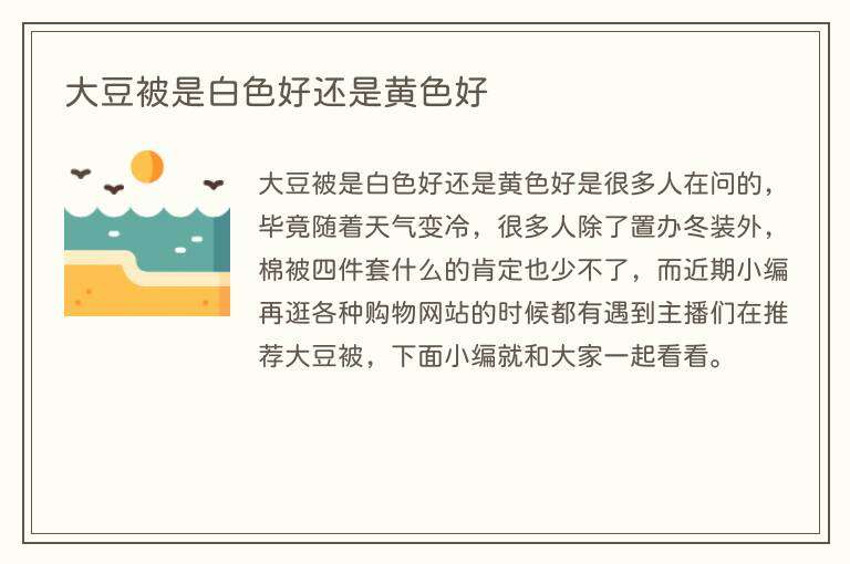 大豆被是白色好还是黄色好是很多人在问的,毕竟随着天气变冷,很多人除了置办冬装外,棉被四件套什么的肯定也少不了,而近期小编再逛各种购物网站的时候都有遇到主播们在推荐大豆被,下面小编就和大家一起看看。