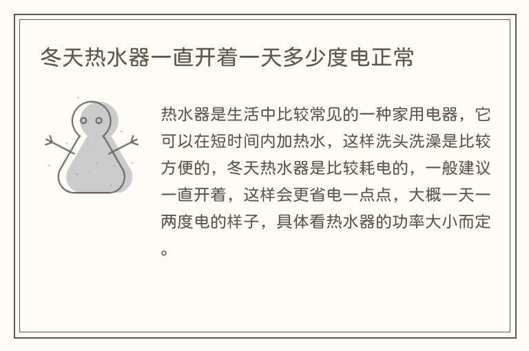 热水器是生活中比较常见的一种家用电器,它可以在短时间内加热水,这样洗头洗澡是比较方便的,冬天热水器是比较耗电的,一般建议一直开着,这样会更省电一点点,大概一天一两度电的样子,具体看热水器的功率大小而定。
