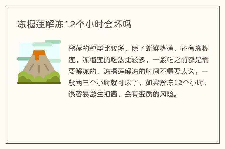 榴莲的种类比较多,除了新鲜榴莲,还有冻榴莲。冻榴莲的吃法比较多,一般吃之前都是需要解冻的,冻榴莲解冻的时间不需要太久,一般两三个小时就可以了,如果解冻12个小时,很容易滋生细菌,会有变质的风险。