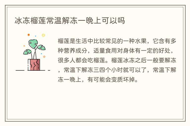 通常,在室温下解冻冷冻榴莲只需3-4小时。如果夏天气温高,这个时间就会缩短。解冻后的榴莲如果没有放在冰箱冷藏,很容易受到高温的影响,导致变质。因此,不建议将冷冻的榴莲在室温下解冻一晚。