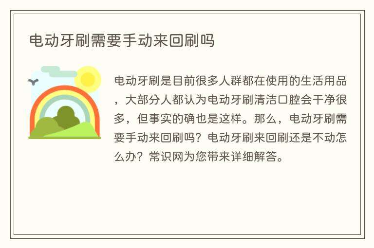 电动牙刷是目前很多人群都在使用的生活用品,大部分人都认为电动牙刷清洁口腔会干净很多,但事实的确也是这样。那么,电动牙刷需要手动来回刷吗?电动牙刷来回刷还是不动怎么办?常识网为您带来详细解答。