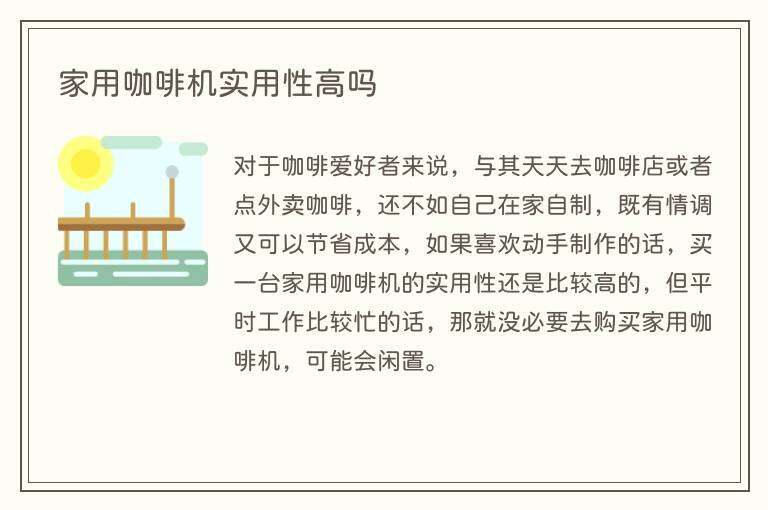 家用咖啡机的实用性因人而异,取决于个人咖啡需求和使用频率。对于咖啡爱好者来说,家用咖啡机可以方便地在家中享受到高品质的咖啡,并且可以控制咖啡的味道和口感,还可以根据自己的口味加入各种调料和糖分。但如果您并不是一个咖啡爱好者,或者只是偶尔需要一杯咖啡,那么购买家用咖啡机可能会显得有些浪费。另外,家用咖啡机需要定期清洁和维护,如果您没有足够的时间和精力进行维护,也可能会影响其实用性。