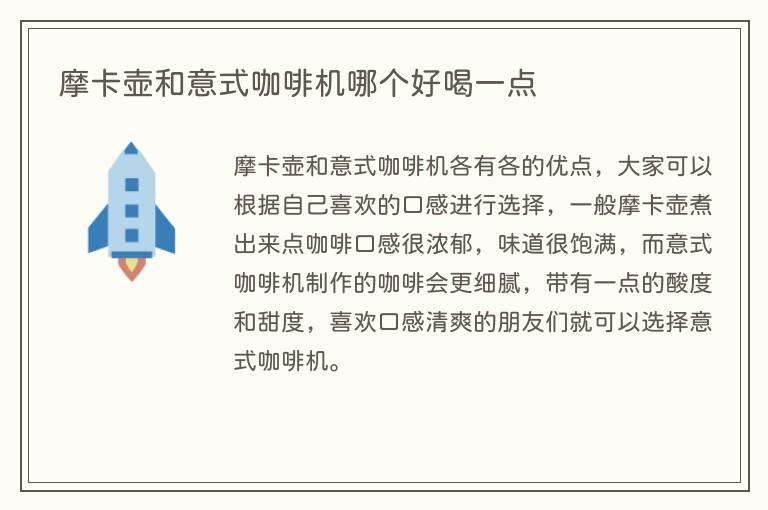 摩卡壶和意式咖啡机各有各的优点,大家可以根据自己喜欢的口感进行选择,一般摩卡壶煮出来点咖啡口感很浓郁,味道很饱满,而意式咖啡机制作的咖啡会更细腻,带有一点的酸度和甜度,喜欢口感清爽的朋友们就可以选择意式咖啡机。