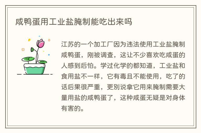 江苏的一个加工厂因为违法使用工业盐腌制咸鸭蛋,刚被调查,这让不少喜欢吃咸蛋的人感到后怕。学过化学的都知道,工业盐和食用盐不一样,它有毒且不能使用,吃了的话后果很严重,更别说拿它用来腌制需要大量用盐的咸鸭蛋了,这种咸蛋无疑是对身体有害的。
