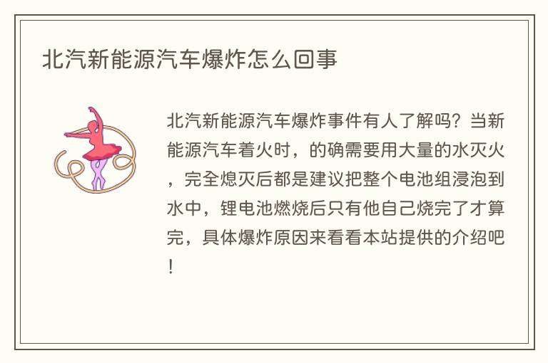 北汽新能源汽车爆炸事件有人了解吗?当新能源汽车着火时,的确需要用大量的水灭火,完全熄灭后都是建议把整个电池组浸泡到水中,锂电池燃烧后只有他自己烧完了才算完,具体爆炸原因来看看本站提供的介绍吧!
