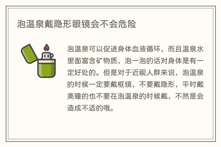 泡温泉是不建议戴隐形眼镜的,在温泉中沐浴时,温泉水温度较高,外部温度低,将导致大量的水蒸气蒸发。 隐形眼镜会吸收水蒸气,长时间保持潮湿状态,容易感染眼睛。 水中的矿物质含量很高,蒸汽会损坏隐形眼镜。