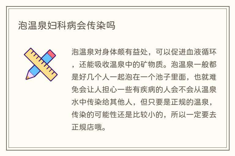 是有可能传染的,尤其是那种小型的、消毒不彻底的温泉,女性是会传染妇科病的。妇女在温泉中浸泡后,必须再次洗澡,换衣服并进行消毒处理。