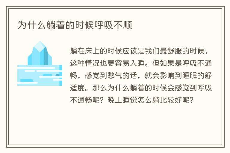 躺在床上的时候应该是我们最舒服的时候,这种情况也更容易入睡。但如果是呼吸不通畅,感觉到憋气的话,就会影响到睡眠的舒适度。那么为什么躺着的时候会感觉到呼吸不通畅呢?晚上睡觉怎么躺比较好呢?