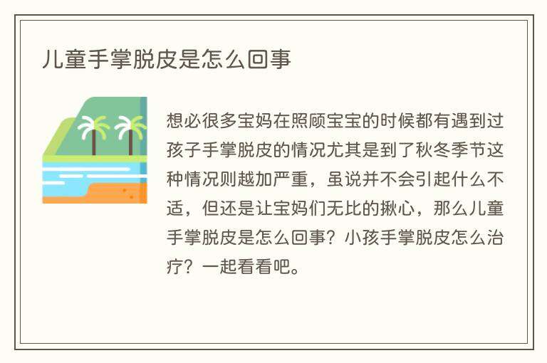 想必很多宝妈在照顾宝宝的时候都有遇到过孩子手掌脱皮的情况尤其是到了秋冬季节这种情况则越加严重,虽说并不会引起什么不适,但还是让宝妈们无比的揪心,那么儿童手掌脱皮是怎么回事?小孩手掌脱皮怎么治疗?一起看看吧。