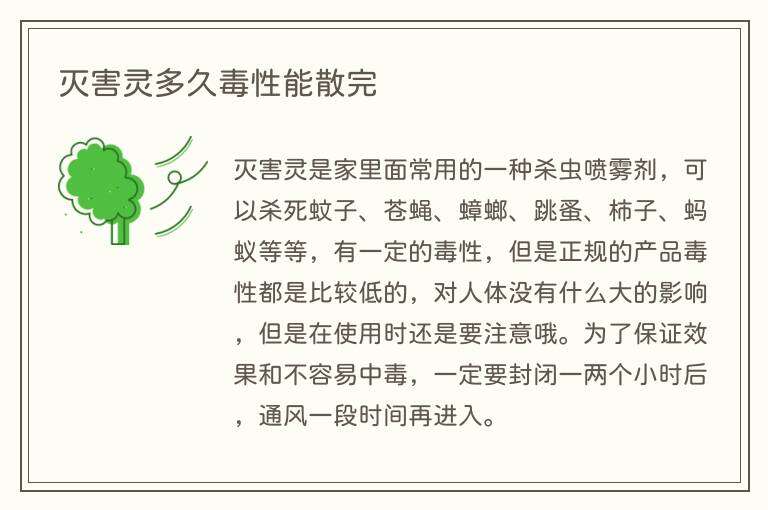 灭害灵是家里面常用的一种杀虫喷雾剂,可以杀死蚊子、苍蝇、蟑螂、跳蚤、柿子、蚂蚁等等,有一定的毒性,但是正规的产品毒性都是比较低的,对人体没有什么大的影响,但是在使用时还是要注意哦。为了保证效果和不容易中毒,一定要封闭一两个小时后,通风一段时间再进入。