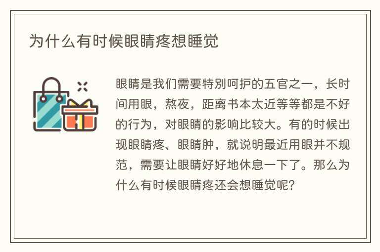 眼睛是我们需要特别呵护的五官之一,长时间用眼,熬夜,距离书本太近等等都是不好的行为,对眼睛的影响比较大。有的时候出现眼睛疼、眼睛肿,就说明最近用眼并不规范,需要让眼睛好好地休息一下了。那么为什么有时候眼睛疼还会想睡觉呢?