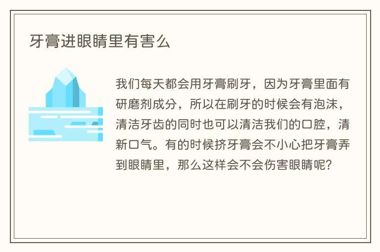 我们每天都会用牙膏刷牙,因为牙膏里面有研磨剂成分,所以在刷牙的时候会有泡沫,清洁牙齿的同时也可以清洁我们的口腔,清新口气。有的时候挤牙膏会不小心把牙膏弄到眼睛里,那么这样会不会伤害眼睛呢?