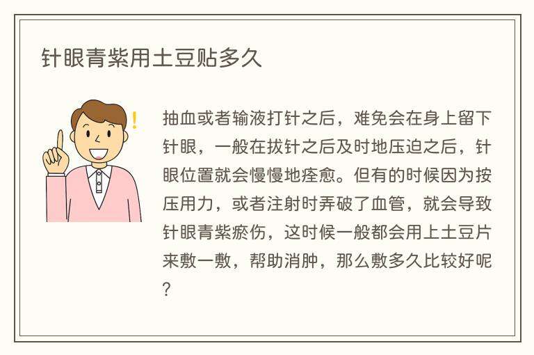 抽血或者输液打针之后,难免会在身上留下针眼,一般在拔针之后及时地压迫之后,针眼位置就会慢慢地痊愈。但有的时候因为按压用力,或者注射时弄破了血管,就会导致针眼青紫瘀伤,这时候一般都会用上土豆片来敷一敷,帮助消肿,那么敷多久比较好呢?