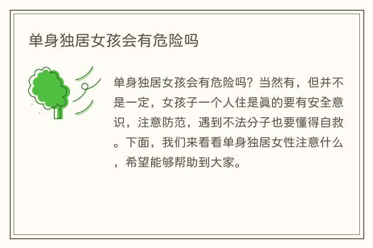单身独居女孩会有危险吗?当然有,但并不是一定,女孩子一个人住是真的要有安全意识,注意防范,遇到不法分子也要懂得自救。下面,我们来看看单身独居女性注意什么,希望能够帮助到大家。