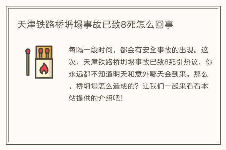 每隔一段时间,都会有安全事故的出现。这次,天津铁路桥坍塌事故已致8死引热议,你永远都不知道明天和意外哪天会到来。那么,桥坍塌怎么造成的?让我们一起来看看本站提供的介绍吧!