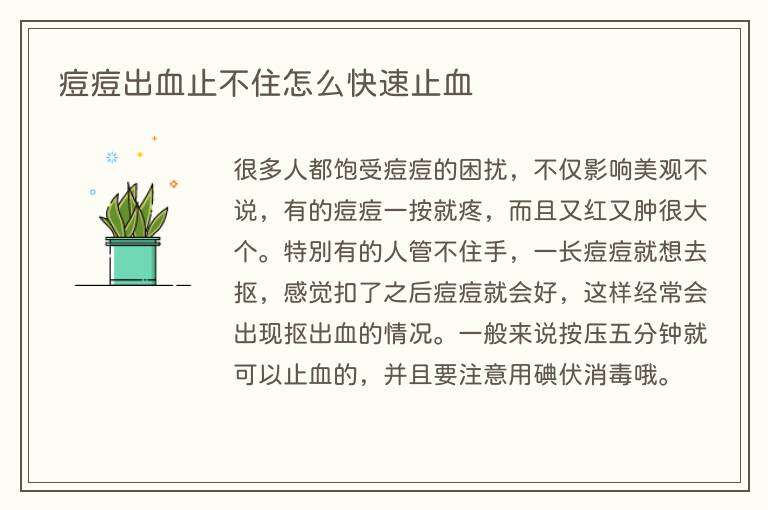 很多人都饱受痘痘的困扰,不仅影响美观不说,有的痘痘一按就疼,而且又红又肿很大个。特别有的人管不住手,一长痘痘就想去抠,感觉扣了之后痘痘就会好,这样经常会出现抠出血的情况。一般来说按压五分钟就可以止血的,并且要注意用碘伏消毒哦。