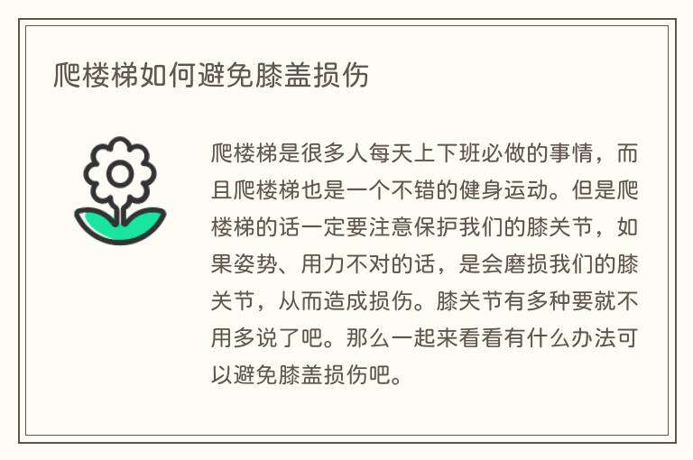 爬楼梯是很多人每天上下班必做的事情,而且爬楼梯也是一个不错的健身运动。但是爬楼梯的话一定要注意保护我们的膝关节,如果姿势、用力不对的话,是会磨损我们的膝关节,从而造成损伤。膝关节有多种要就不用多说了吧。那么一起来看看有什么办法可以避免膝盖损伤吧。