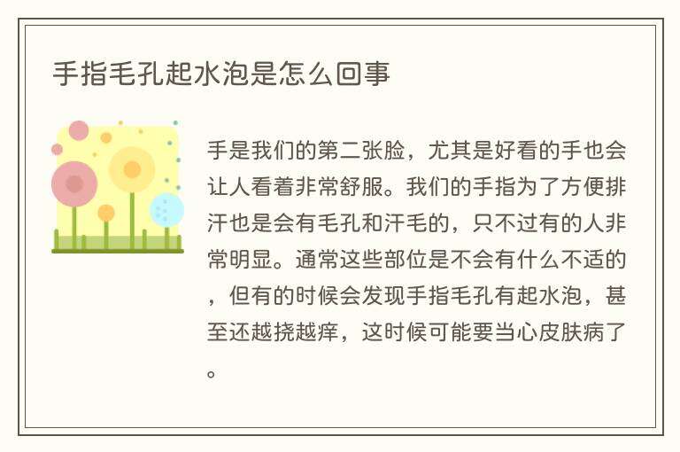 手是我们的第二张脸,尤其是好看的手也会让人看着非常舒服。我们的手指为了方便排汗也是会有毛孔和汗毛的,只不过有的人非常明显。通常这些部位是不会有什么不适的,但有的时候会发现手指毛孔有起水泡,甚至还越挠越痒,这时候可能要当心皮肤病了。