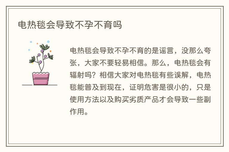 电热毯会导致不孕不育的是谣言,没那么夸张,大家不要轻易相信。那么,电热毯会有辐射吗?相信大家对电热毯有些误解,电热毯能普及到现在,证明危害是很小的,只是使用方法以及购买劣质产品才会导致一些副作用。