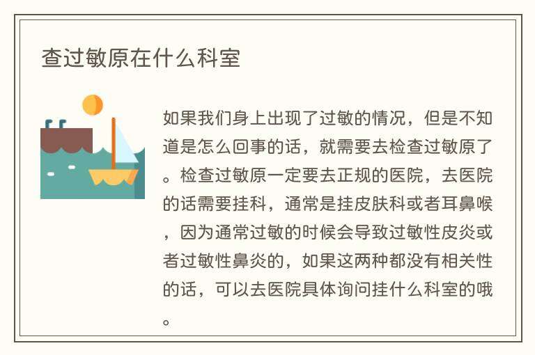 如果我们身上出现了过敏的情况,但是不知道是怎么回事的话,就需要去检查过敏原了。检查过敏原一定要去正规的医院,去医院的话需要挂科,通常是挂皮肤科或者耳鼻喉,因为通常过敏的时候会导致过敏性皮炎或者过敏性鼻炎的,如果这两种都没有相关性的话,可以去医院具体询问挂什么科室的哦。