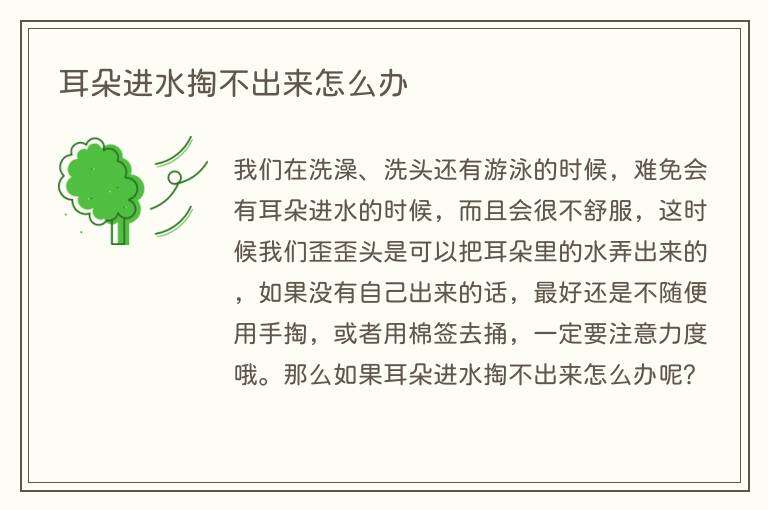 我们在洗澡、洗头还有游泳的时候,难免会有耳朵进水的时候,而且会很不舒服,这时候我们歪歪头是可以把耳朵里的水弄出来的,如果没有自己出来的话,最好还是不随便用手掏,或者用棉签去捅,一定要注意力度哦。那么如果耳朵进水掏不出来怎么办呢?