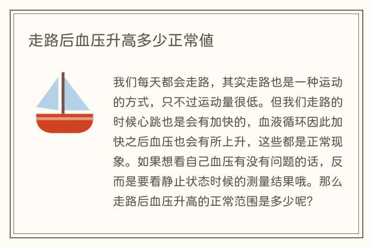 我们每天都会走路,其实走路也是一种运动的方式,只不过运动量很低。但我们走路的时候心跳也是会有加快的,血液循环因此加快之后血压也会有所上升,这些都是正常现象。如果想看自己血压有没有问题的话,反而是要看静止状态时候的测量结果哦。那么走路后血压升高的正常范围是多少呢?