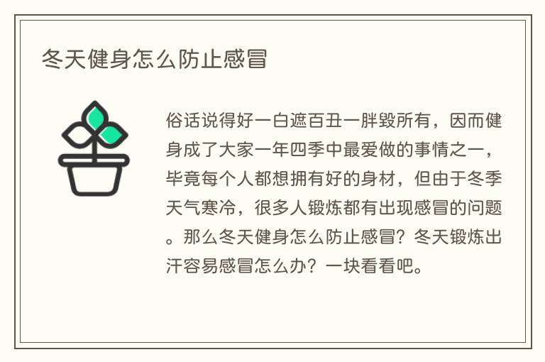俗话说得好一白遮百丑一胖毁所有,因而健身成了大家一年四季中最爱做的事情之一,毕竟每个人都想拥有好的身材,但由于冬季天气寒冷,很多人锻炼都有出现感冒的问题。那么冬天健身怎么防止感冒?冬天锻炼出汗容易感冒怎么办?一块看看吧。