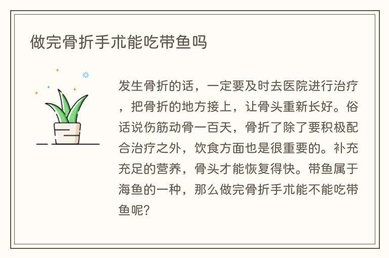 发生骨折的话,一定要及时去医院进行治疗,把骨折的地方接上,让骨头重新长好。俗话说伤筋动骨一百天,骨折了除了要积极配合治疗之外,饮食方面也是很重要的。补充充足的营养,骨头才能恢复得快。带鱼属于海鱼的一种,那么做完骨折手术能不能吃带鱼呢?