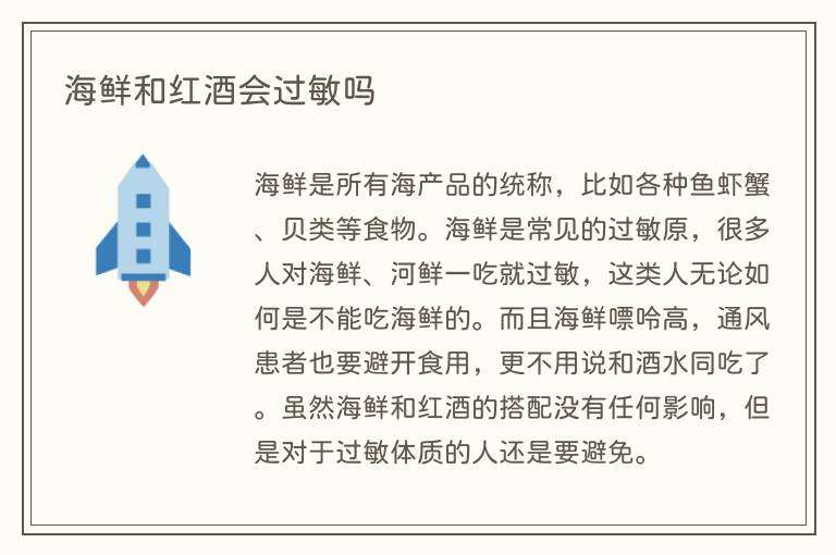 这两种一起是不会导致过敏的,但如果本身就对海鲜过敏的话,吃海鲜喝不喝红酒都会出现过敏的情况。另外如果对酒精过敏的人,也要少喝红酒,因为红酒将含有少量酒精,酒精也能在很大程度上引起过敏反应。所以过敏体质的人要避免这种搭配,这是预防食物过敏最有效的方法。