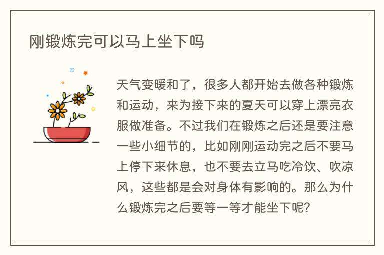 天气变暖和了,很多人都开始去做各种锻炼和运动,来为接下来的夏天可以穿上漂亮衣服做准备。不过我们在锻炼之后还是要注意一些小细节的,比如刚刚运动完之后不要马上停下来休息,也不要去立马吃冷饮、吹凉风,这些都是会对身体有影响的。那么为什么锻炼完之后要等一等才能坐下呢?