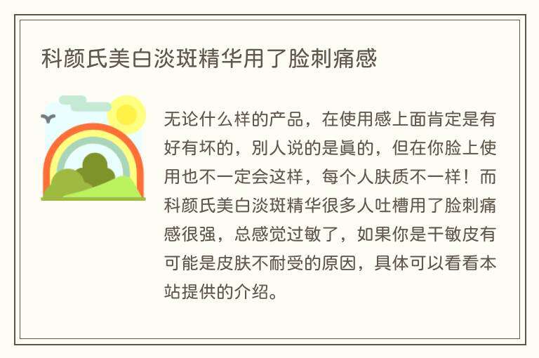 无论什么样的产品,在使用感上面肯定是有好有坏的,别人说的是真的,但在你脸上使用也不一定会这样,每个人肤质不一样!而科颜氏美白淡斑精华很多人吐槽用了脸刺痛感很强,总感觉过敏了,如果你是干敏皮有可能是皮肤不耐受的原因,具体可以看看本站提供的介绍。