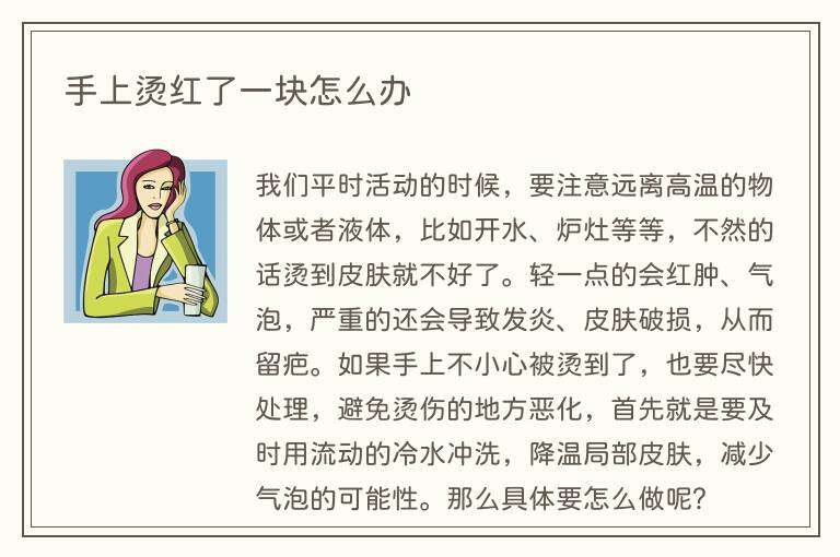 烫红后要及时用流动的冷水冲洗,减少局部热反应,尽量减少热损伤。或用冰水冰敷,然后涂烫伤软膏,大多数几天后会好转。如果起了水泡,而且很严重的话要防止感染,可用碘酚局部消毒,也需要使用有效的抗菌药物积极治疗,一般需要去医院,在医生的指导下正确治疗。