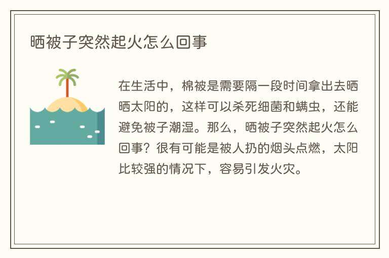 在生活中,棉被是需要隔一段时间拿出去晒晒太阳的,这样可以杀死细菌和螨虫,还能避免被子潮湿。那么,晒被子突然起火怎么回事?很有可能是被人扔的烟头点燃,太阳比较强的情况下,容易引发火灾。
