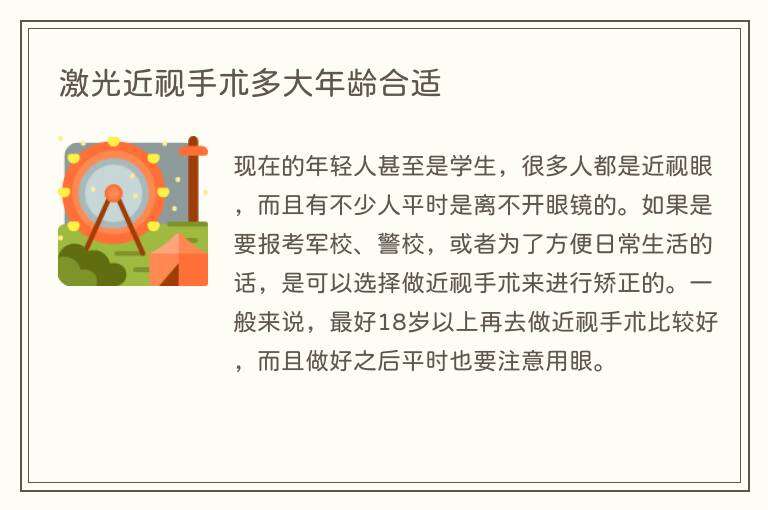 现在的年轻人甚至是学生,很多人都是近视眼,而且有不少人平时是离不开眼镜的。如果是要报考军校、警校,或者为了方便日常生活的话,是可以选择做近视手术来进行矫正的。一般来说,最好18岁以上再去做近视手术比较好,而且做好之后平时也要注意用眼。