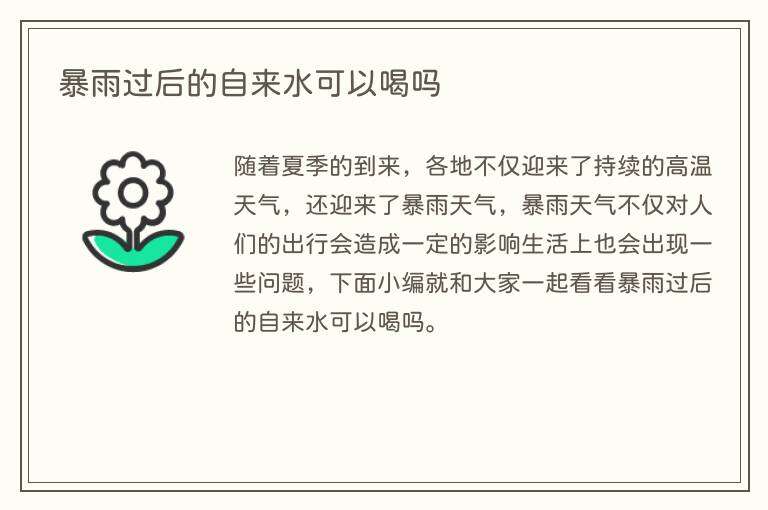 暴雨过后的自来水不可以喝,但如果在急需水源的情况下可以用这样的水来蒸馏水分,蒸馏出的水蒸气凝结后可以饮用。从外也可以去买个水缸,将浑浊的水倒入水缸里面,然后家里买一些明矾回来,专门用来洁净水的。这样就可以正常饮用了。
