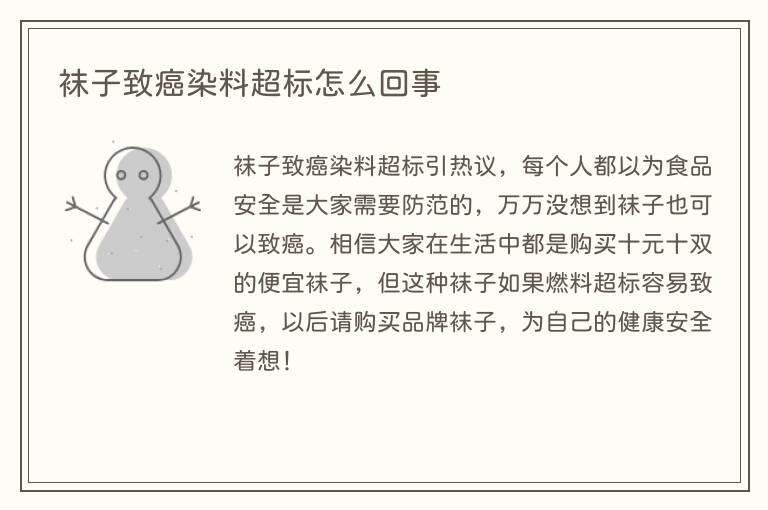 袜子致癌染料超标引热议,每个人都以为食品安全是大家需要防范的,万万没想到袜子也可以致癌。相信大家在生活中都是购买十元十双的便宜袜子,但这种袜子如果燃料超标容易致癌,以后请购买品牌袜子,为自己的健康安全着想!