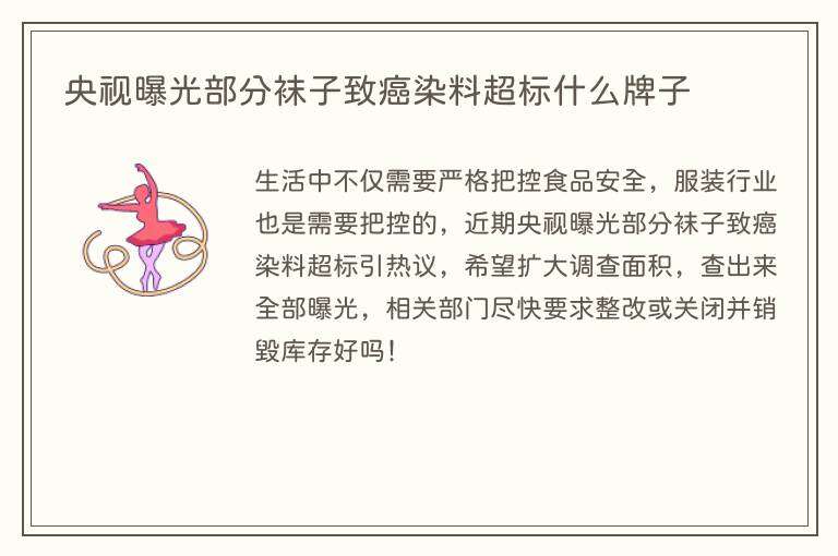 生活中不仅需要严格把控食品安全,服装行业也是需要把控的,近期央视曝光部分袜子致癌染料超标引热议,希望扩大调查面积,查出来全部曝光,相关部门尽快要求整改或关闭并销毁库存好吗!