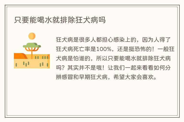 喝水不排除狂犬病的症状。一般来说,患狂犬病时,只怕水流声。 当你听到水流的声音时,你会表现出焦虑和内心躁狂的症状,不过狂犬病患者也可以喝水,所以喝水与狂犬病的关系不大。