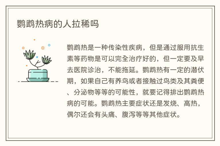 鹦鹉热是一种传染性疾病,但是通过服用抗生素等药物是可以完全治疗好的,但一定要及早去医院诊治,不能拖延。鹦鹉热有一定的潜伏期,如果自己有养鸟或者接触过鸟类及其粪便、分泌物等等的可能性,就要记得排出鹦鹉热病的可能。鹦鹉热主要症状还是发烧、高热,偶尔还会有头痛、腹泻等等其他症状。