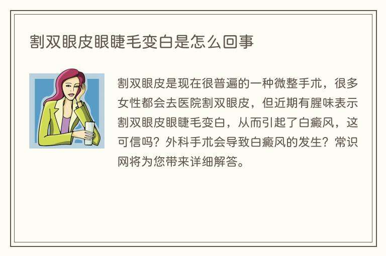 割双眼皮是现在很普遍的一种微整手术,很多女性都会去医院割双眼皮,但近期有腥味表示割双眼皮眼睫毛变白,从而引起了白癜风,这可信吗?外科手术会导致白癜风的发生?常识网将为您带来详细解答。