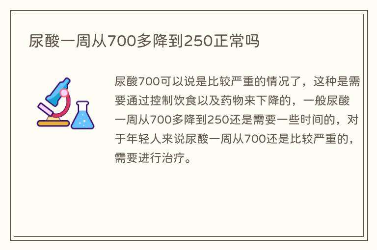 尿酸700可以说是比较严重的情况了,这种是需要通过控制饮食以及药物来下降的,一般尿酸一周从700多降到250还是需要一些时间的,对于年轻人来说尿酸一周从700还是比较严重的,需要进行治疗。