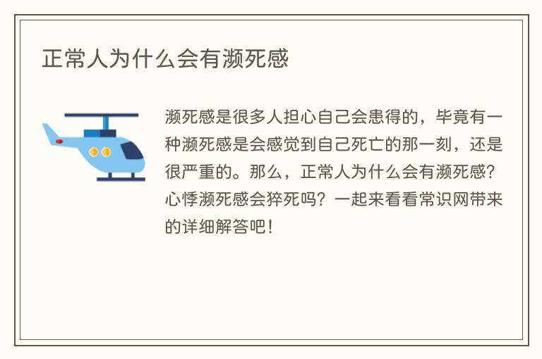 濒死感是很多人担心自己会患得的,毕竟有一种濒死感是会感觉到自己死亡的那一刻,还是很严重的。那么,正常人为什么会有濒死感?心悸濒死感会猝死吗?一起来看看常识网带来的详细解答吧!