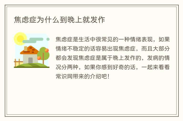 焦虑症是生活中很常见的一种情绪表现,如果情绪不稳定的话容易出现焦虑症,而且大部分都会发现焦虑症是属于晚上发作的,发病的情况分两种,如果你感到好奇的话,一起来看看常识网带来的介绍吧!
