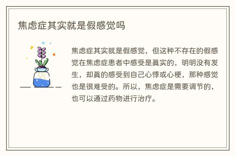 焦虑症其实就是假感觉,但这种不存在的假感觉在焦虑症患者中感受是真实的,明明没有发生,却真的感受到自己心悸或心梗,那种感觉也是很难受的。所以,焦虑症是需要调节的,也可以通过药物进行治疗。