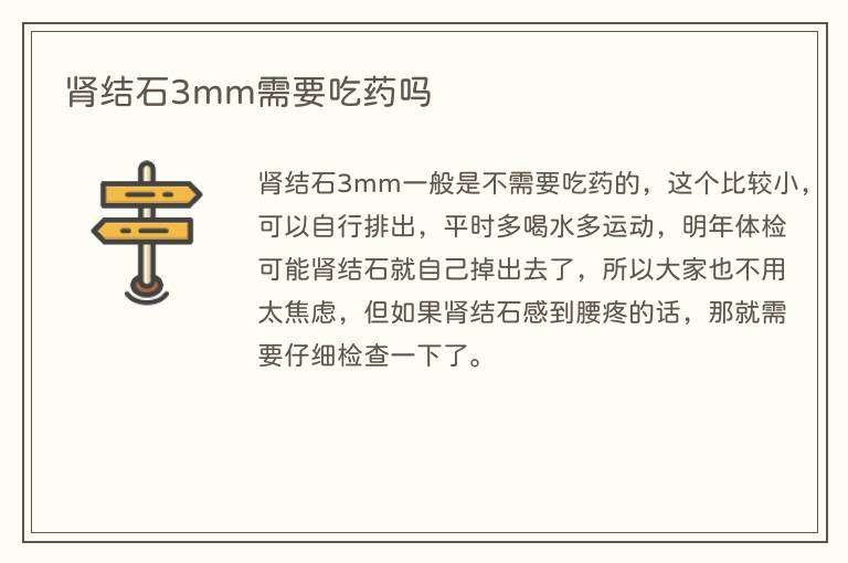肾结石3mm一般是不需要吃药的,这个比较小,可以自行排出,平时多喝水多运动,明年体检可能肾结石就自己掉出去了,所以大家也不用太焦虑,但如果肾结石感到腰疼的话,那就需要仔细检查一下了。
