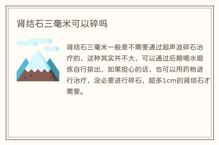 肾结石三毫米一般是不需要通过超声波碎石治疗的,这种其实并不大,可以通过后期喝水锻炼自行排出,如果担心的话,也可以用药物进行治疗,没必要进行碎石,超多1cm的肾结石才需要。